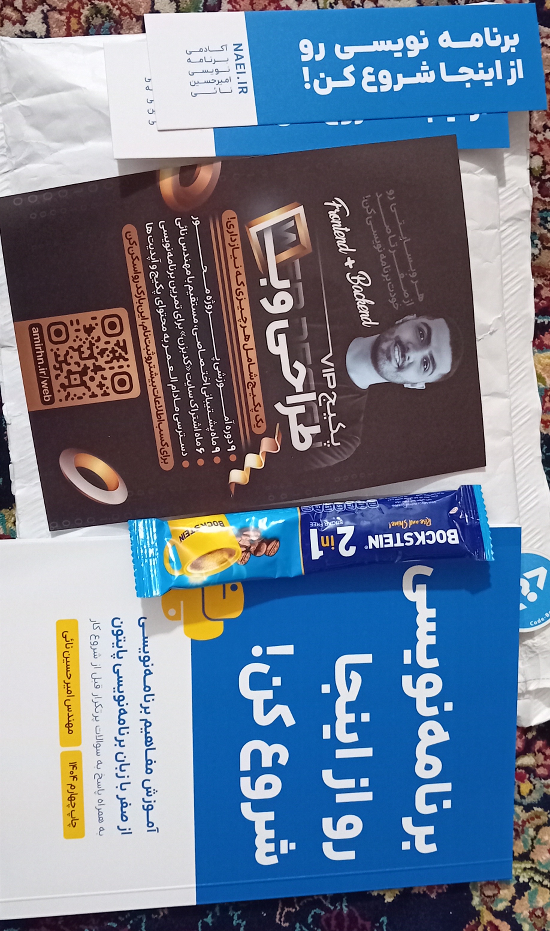بعد از یک هفته پستچی زنگ درب خونه رو زد؛ با سرعت برق و باد به سمت درب دویدم و سریع خودمو به پستچی رسوندم، بسته رو تحویل گرفتم و بلافاصله بازش کردم. کتابی که خریده بودم مربوط به آموزش پایتون بود، جلد زرد و آبی داشت و از ذوق اولین کتاب برنامهنویسی که توی دستام بود، داشتم بال در میوردم... کات!